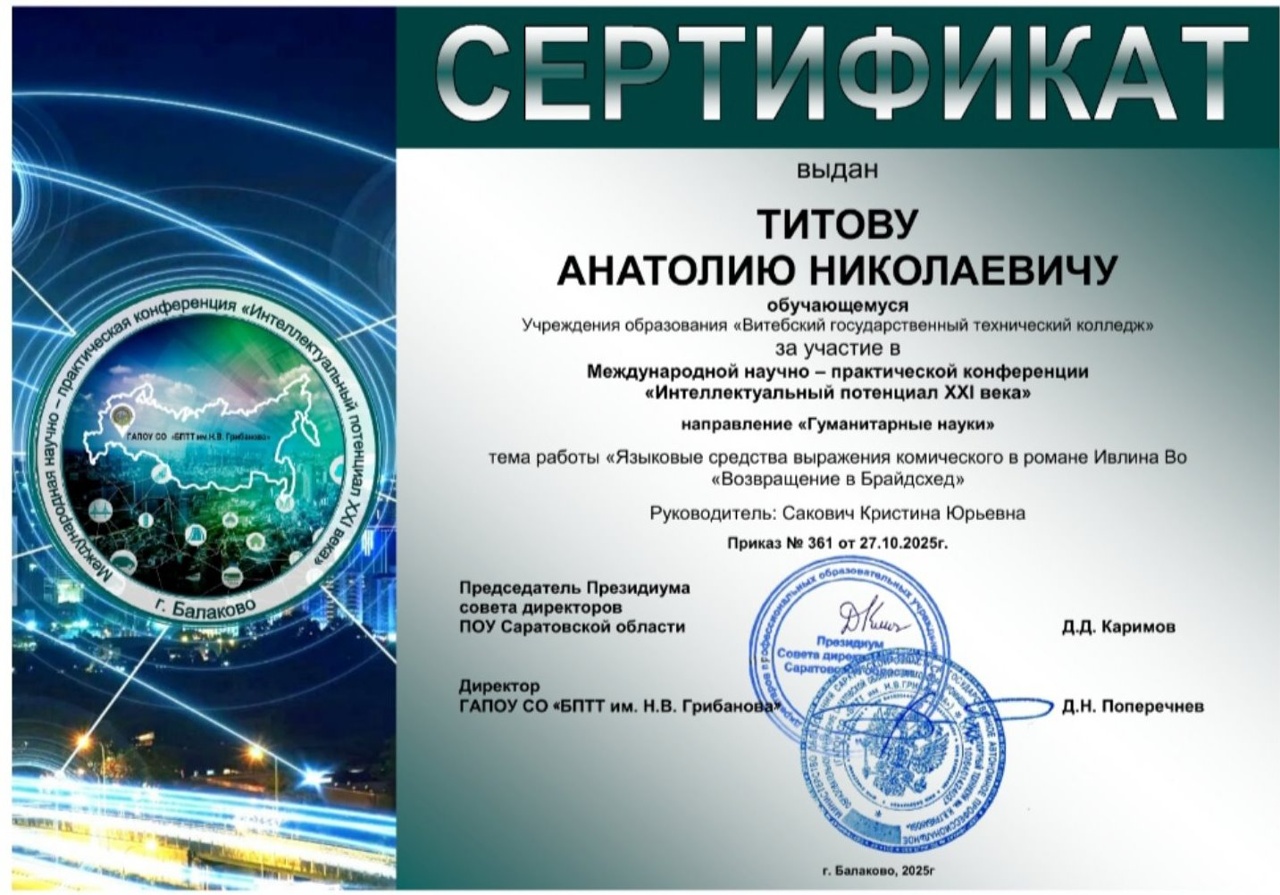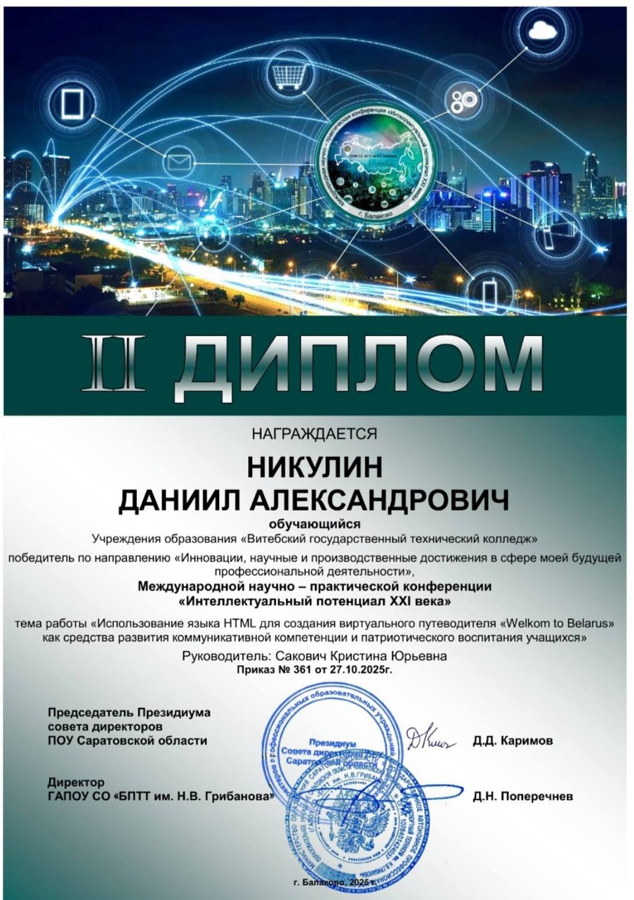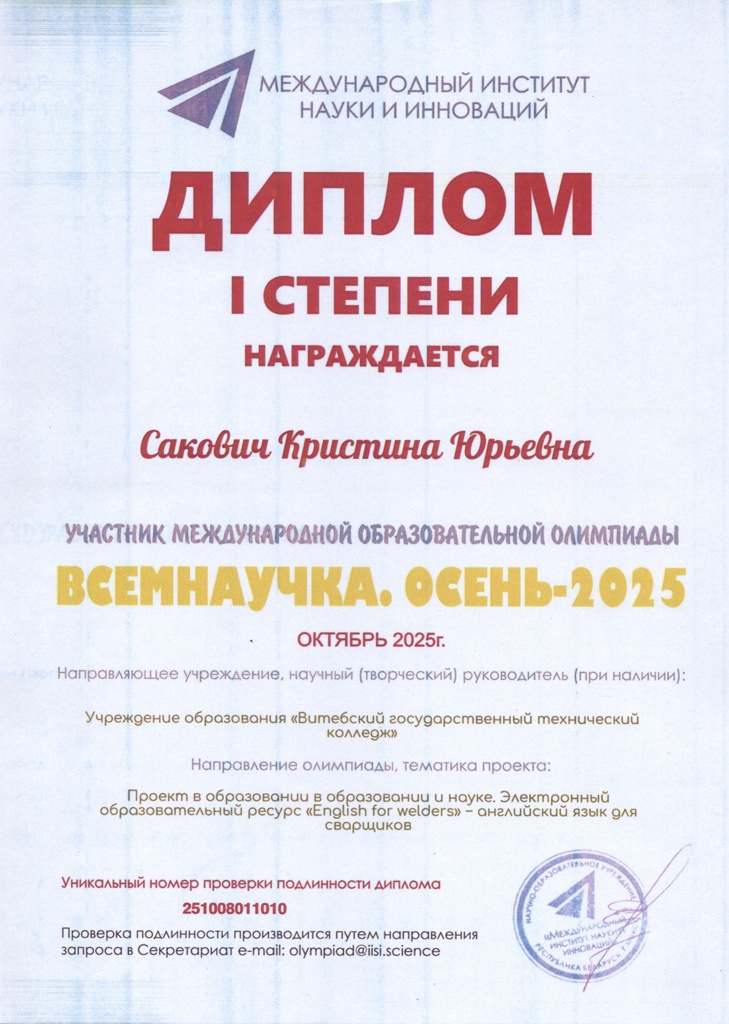 "Познайка.Осень-2025" По результатам участия в международной детской исследовательской олимпиаде "Познайка.Осень-2025" дипломами 1 степени удостоены преподаватель Сакович Кристина Юрьевна, учащийся колледжа Никулин Даниил Александрович.
