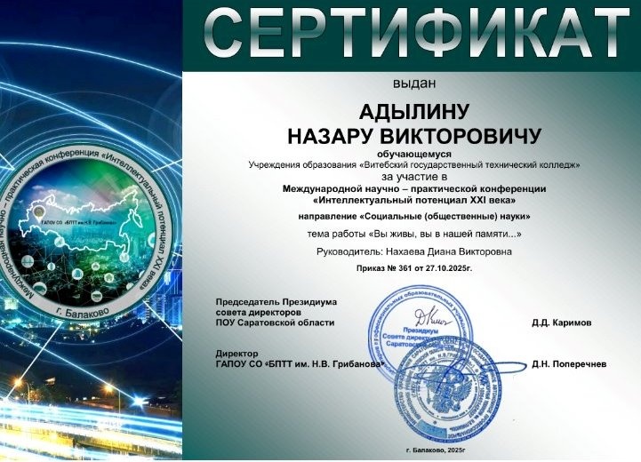 Сертификатами участников награждены учащиеся Титов Анатолий Николаевич, Адылин Назар Викторович.