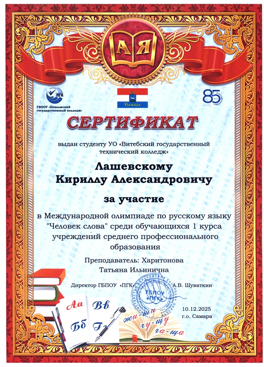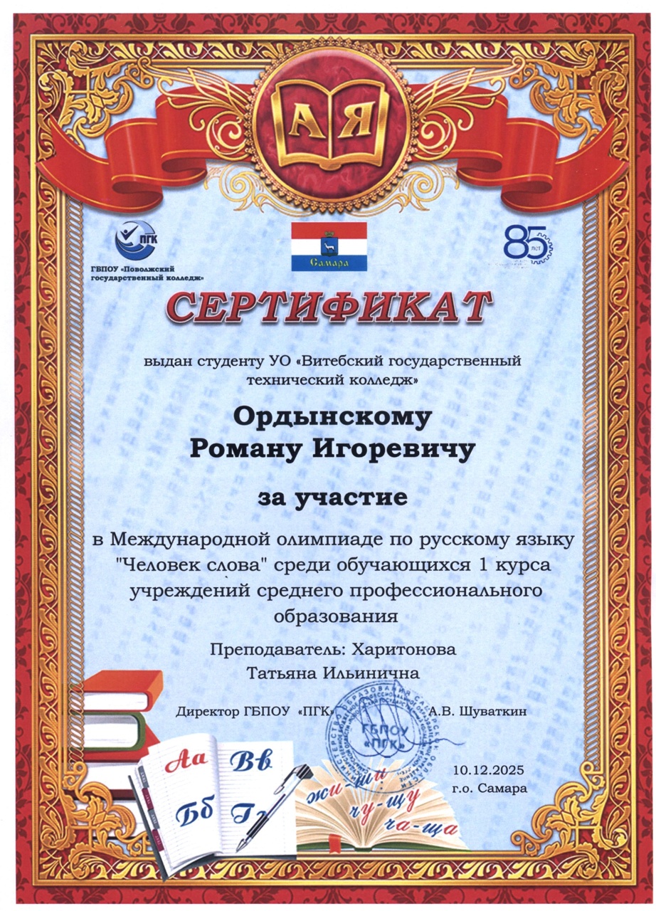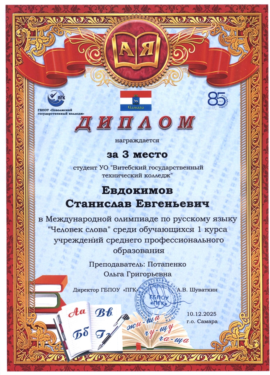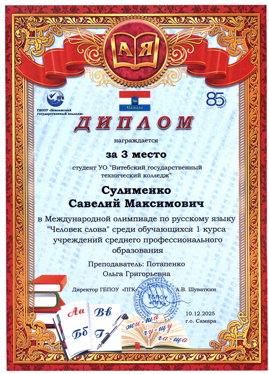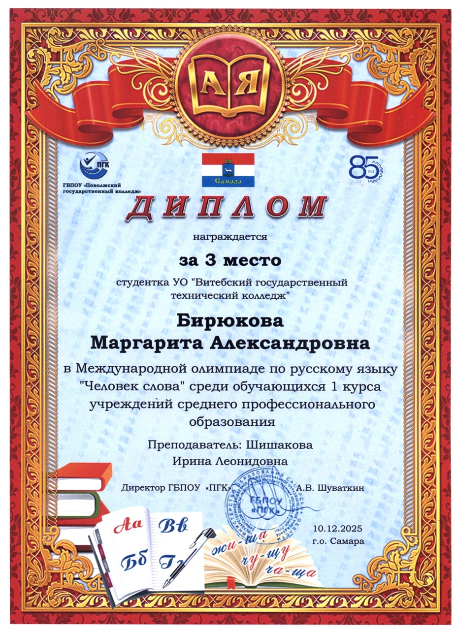 В декабре 2025 года состоялась международная олимпиада по русскому языку "Человек слова" среди обучающихся 1 курса учреждений среднего профессионального образования. Наши учащиеся и преподаватели заслуженно получили дипломы III степени и сертификаты участника.
