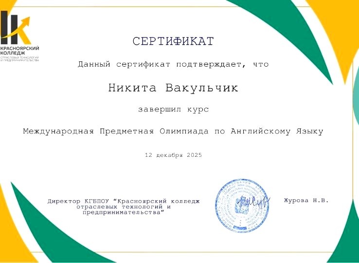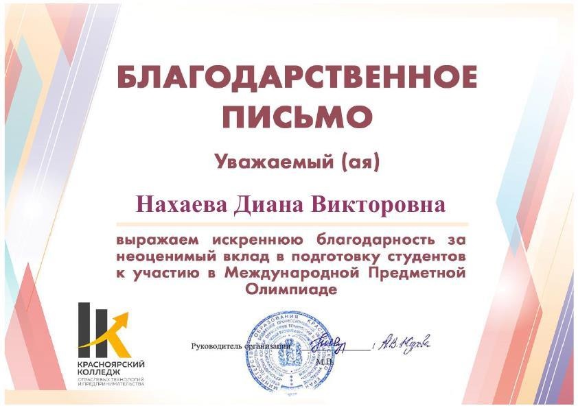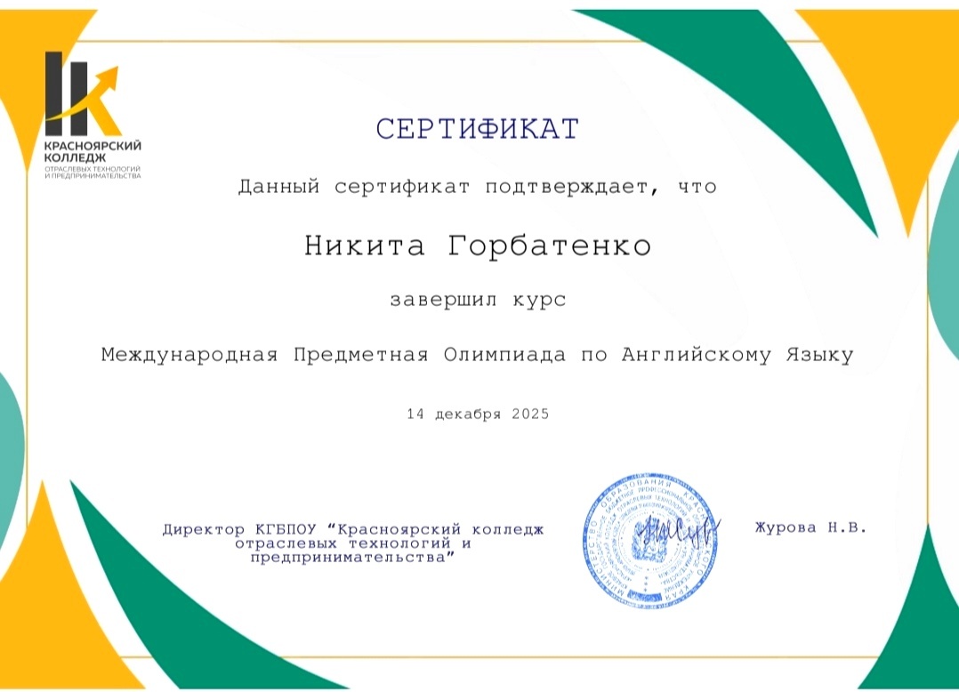 Учащиеся колледжа Никита Горбатенко, Никита Вакульчик участвовали в Международной Предметной Олимпиаде по английскому языку, проводимой на базе КГБПОУ "Красноярский колледж отраслевых технологий и предпринимательства". Преподавателям Нахаевой Диане Викторовне, Долгой Анастасии Сергеевне вручены благодарственные письма за подготовку учащихся.