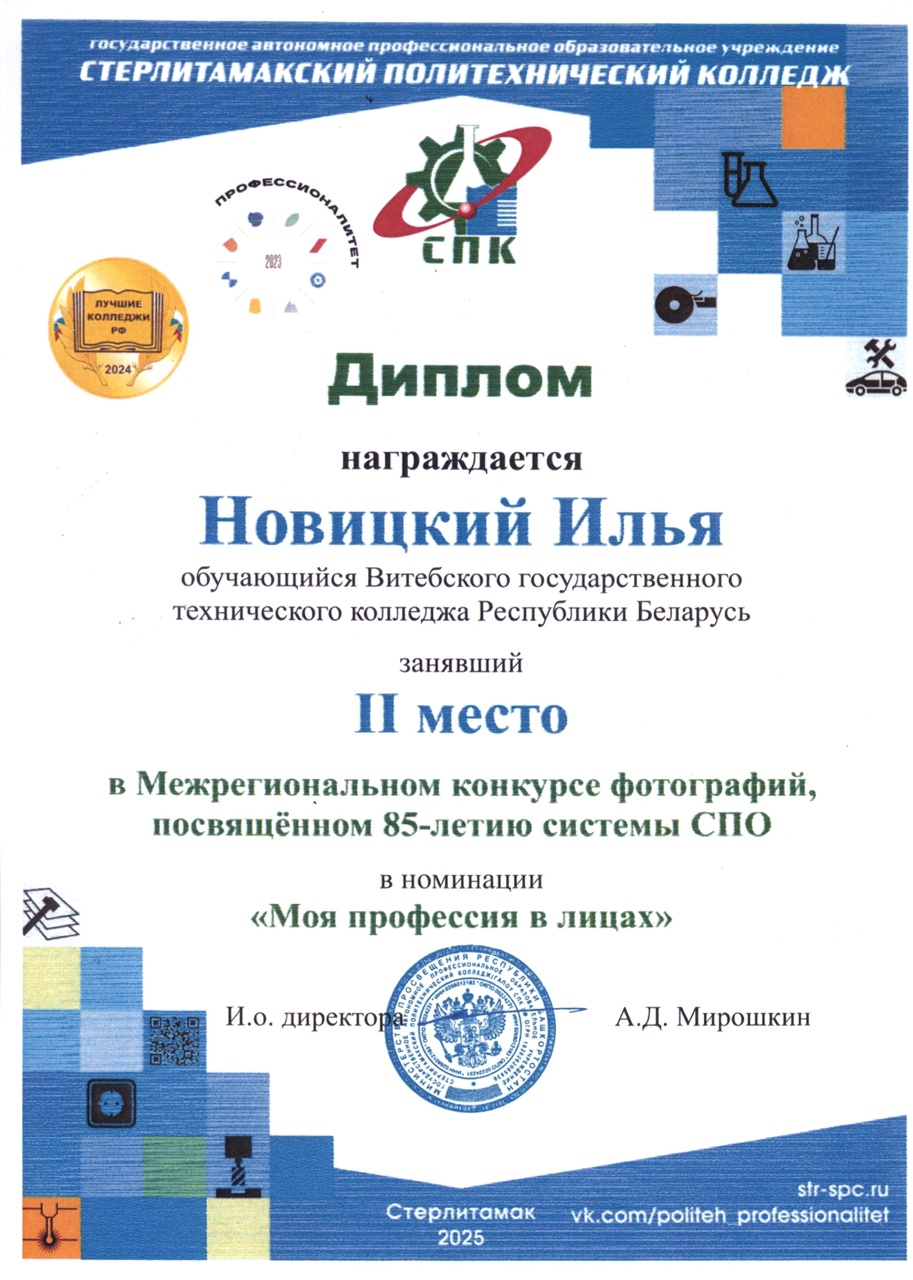 По результатам участия в Межрегиональном конкурсе фотографий, посвященном 85-летию системы ПТО дипломом 1 степени награждён учащийся Петров Илья, дипломом 2 степени награжден Новицкий Илья.