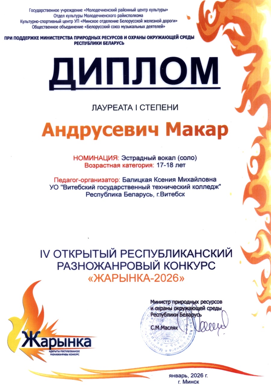 По итогам IV открытого республиканского разножанрового конкурса «Жарынка-2026» диплом I степени был