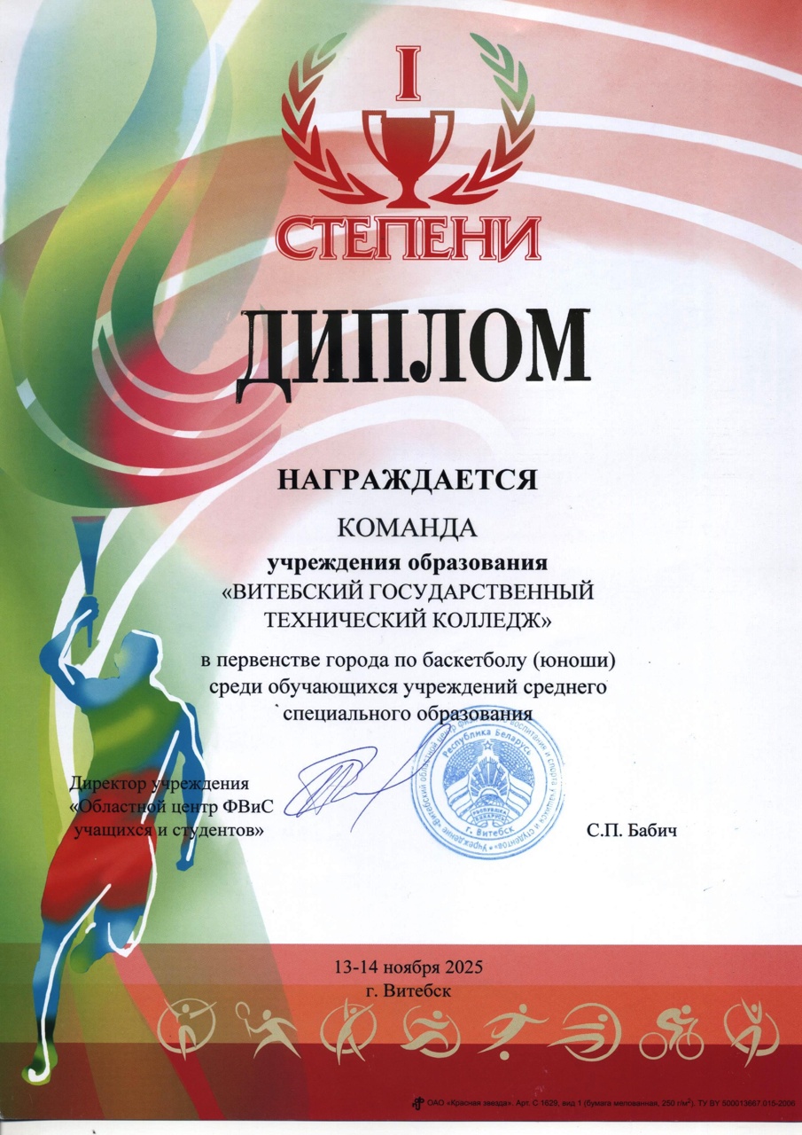 Баскетбол 13-14 ноября 2025 года прошли городские соревнования по баскетболу среди учащихся учреждений профессионально-технического и среднего специального образования. Команда коллдежа заняла почетное I место.