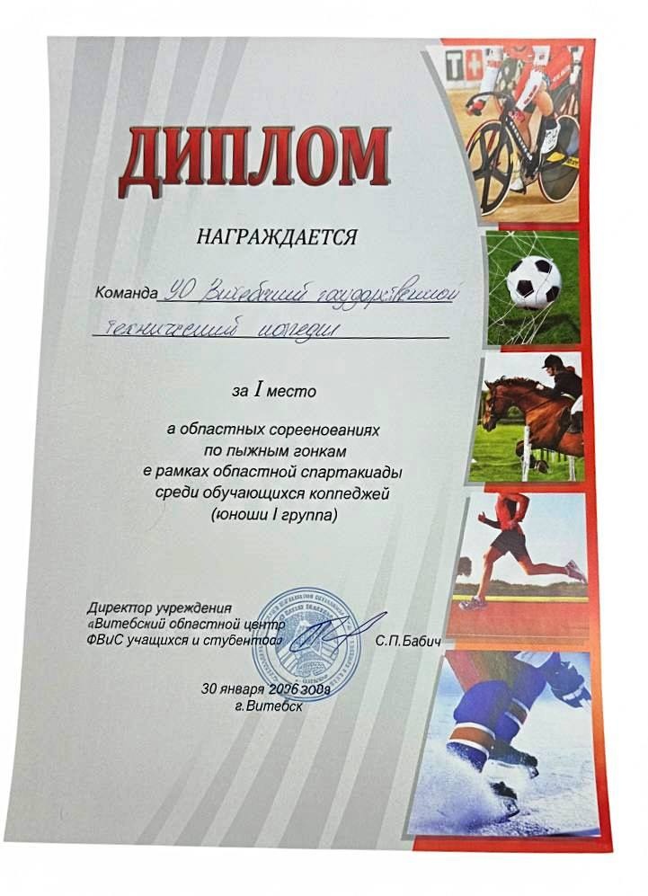 Сборная команда Учреждения образования "Витебский государственный технический колледж" завоевала первое общекомандное место в областных соревнованиях по лыжным гонкам в рамках спартакиады среди учащихся колледжей в Витебске и