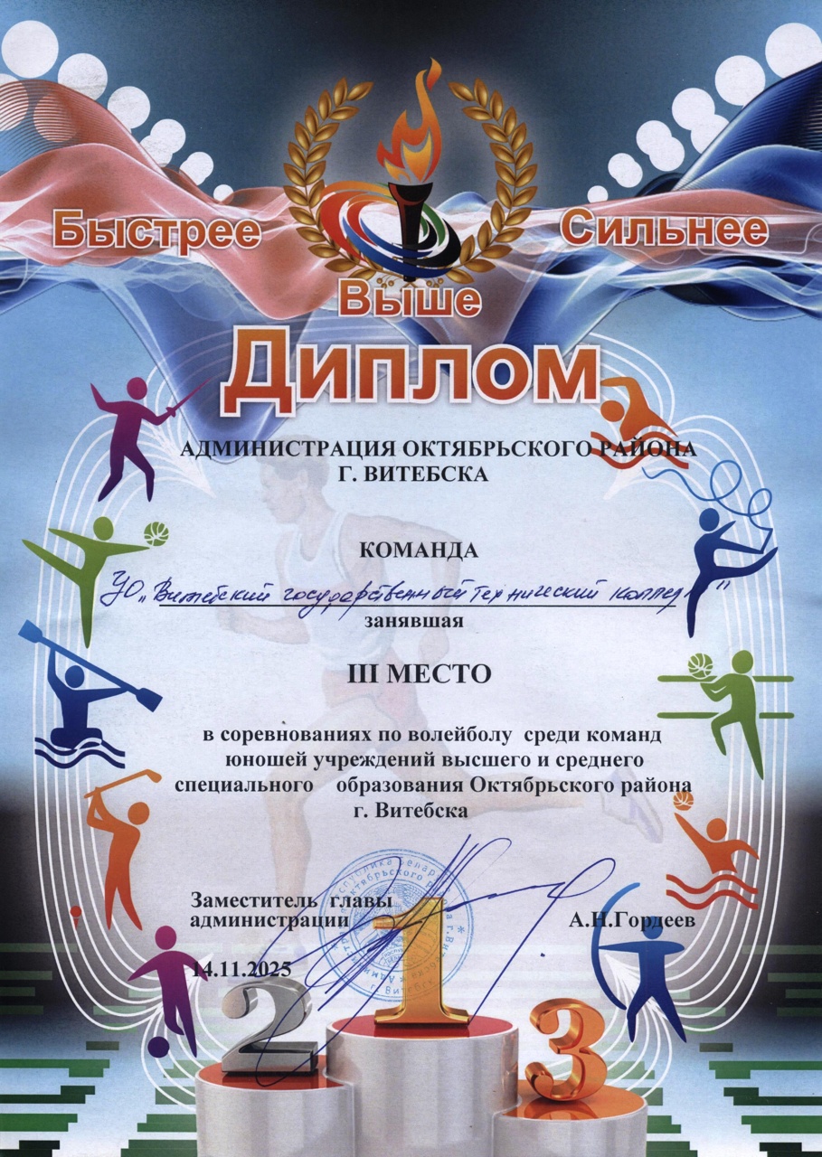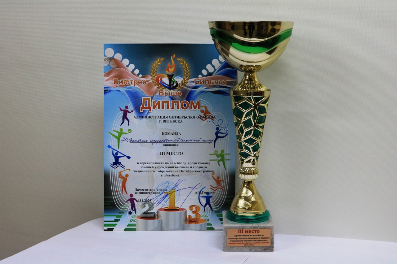 Команда колледжа заняла почетное III место в соревнованиях по волейболу среди команд юношей учреждений высшего и среднего специального образования Октябрьского района города Витебска.