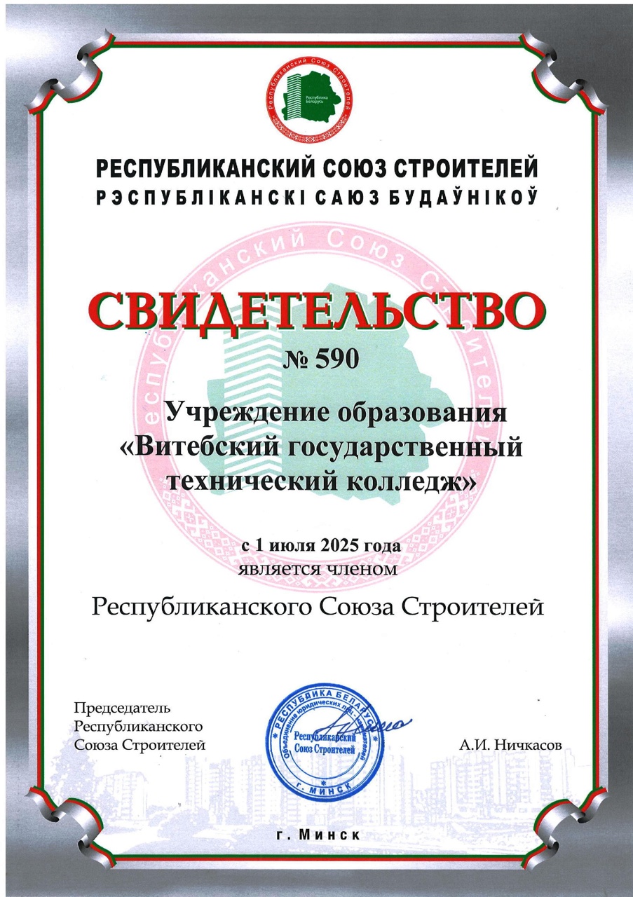 Витебский государственный технический колледж с 1 июля 2025 года является членом Республиканского Союза Строителей.