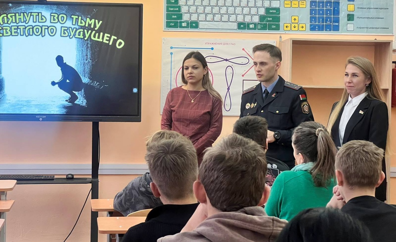 Перед учащимися выступила инспектор ИДН администрации Октябрьского района г Витебска Бацурина Ю. В.. проинформировав учащихся об ответственности по ст. 328 УК Республики Беларусь, о вреде алкоголя на организм несовершеннолетнего ответственность по ст. 166-169, 343 УК Республики Беларусь, рассказала об ответственности совершения преступлений против собственности.