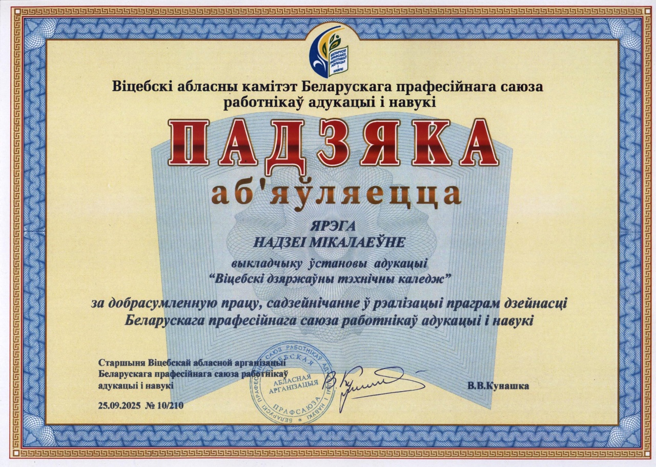 АрхНовация - 2025 По результатам областного этапа Республиканской выставки-конкурса детского творчества "АрхНовация - 2025" в номинации "Графика" дипломом I степени награждена учащаяся колледжа Искол Мария (научный руководитель - Гриценко Елена Борисовна).