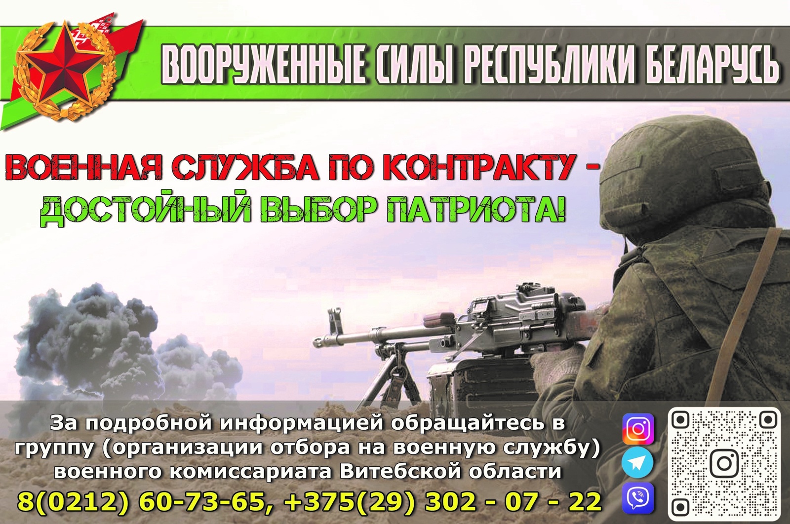 Если служба в Вооруженных Силах – твое призвание, мы ждем тебя по адресу: г. Витебск, ул. Ленинградская, д. 18, военный комиссариат Витебской области, контактные телефоны: 8(212)60-73-65, +375(29)302-07-22.