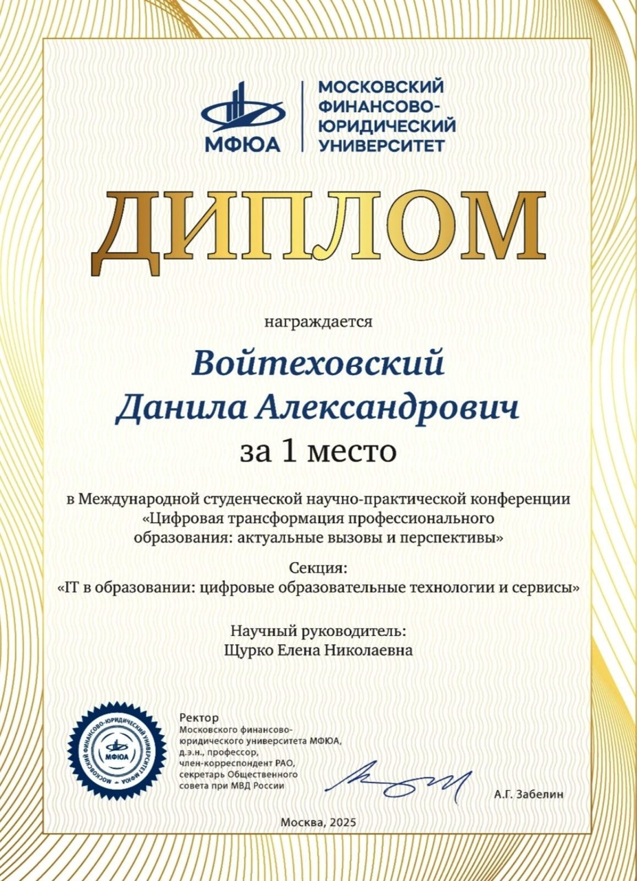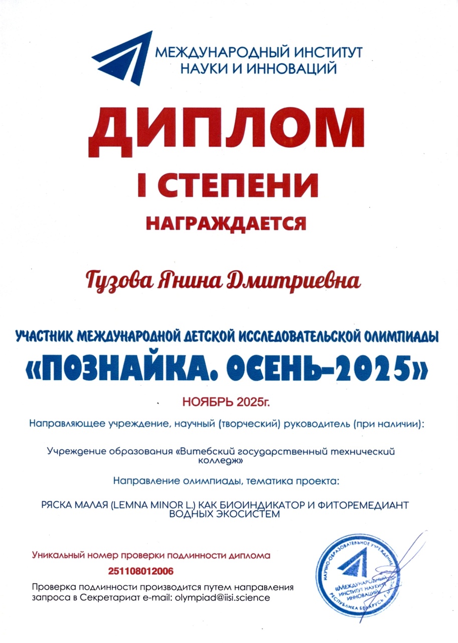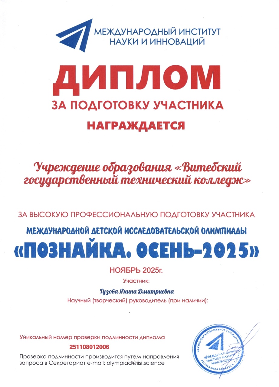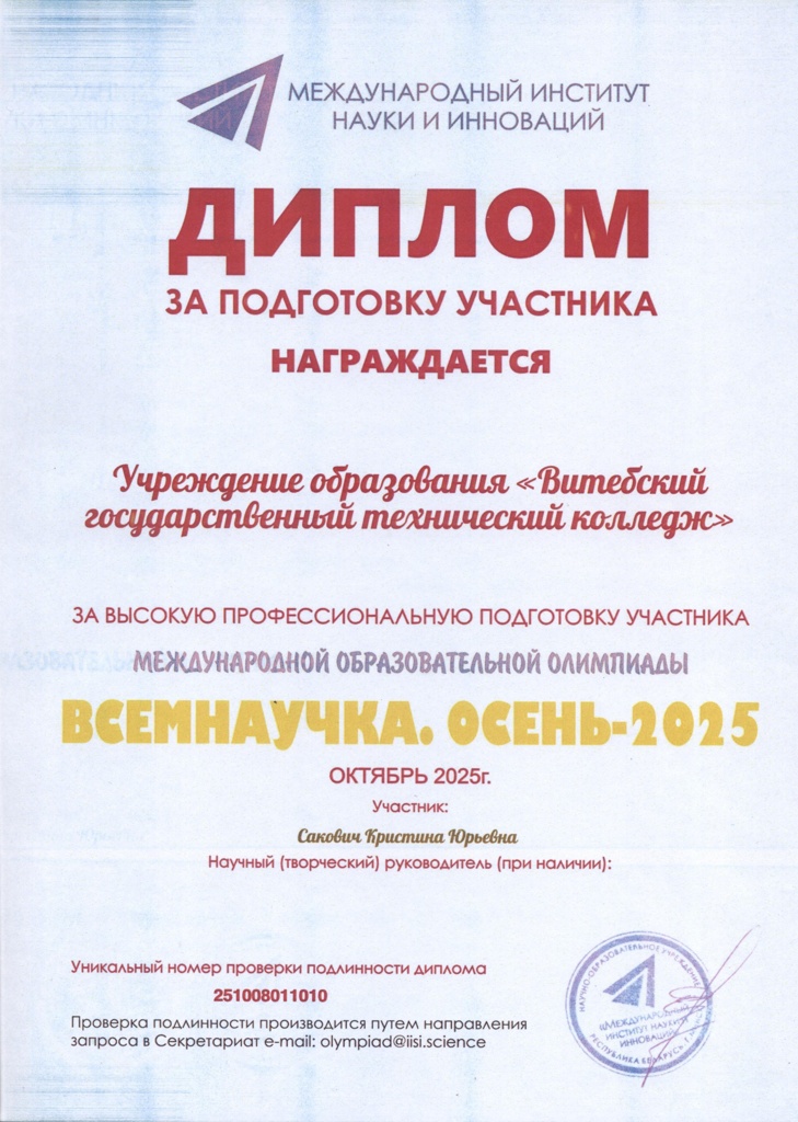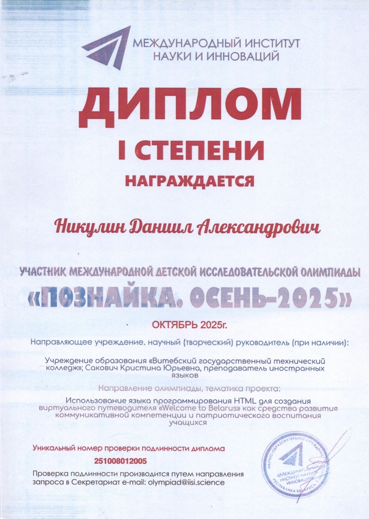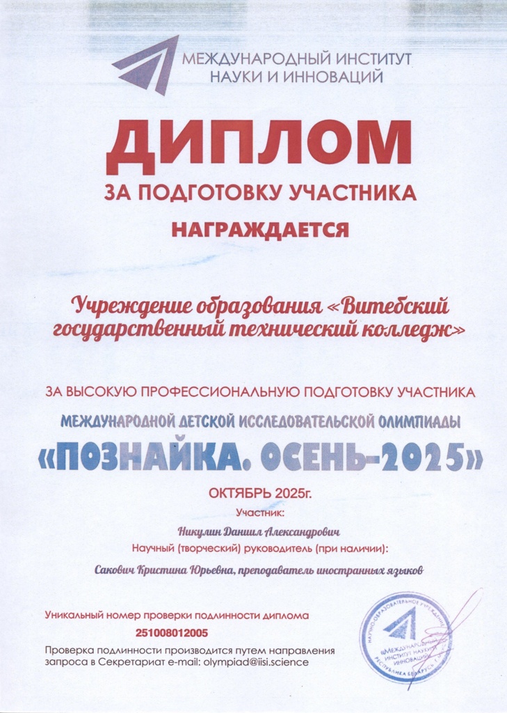 "Познайка.Осень-2025" По результатам участия в международной детской исследовательской олимпиаде "Познайка.Осень-2025" дипломами 1 степени удостоены преподаватель Сакович Кристина Юрьевна, учащийся колледжа Никулин Даниил Александрович.