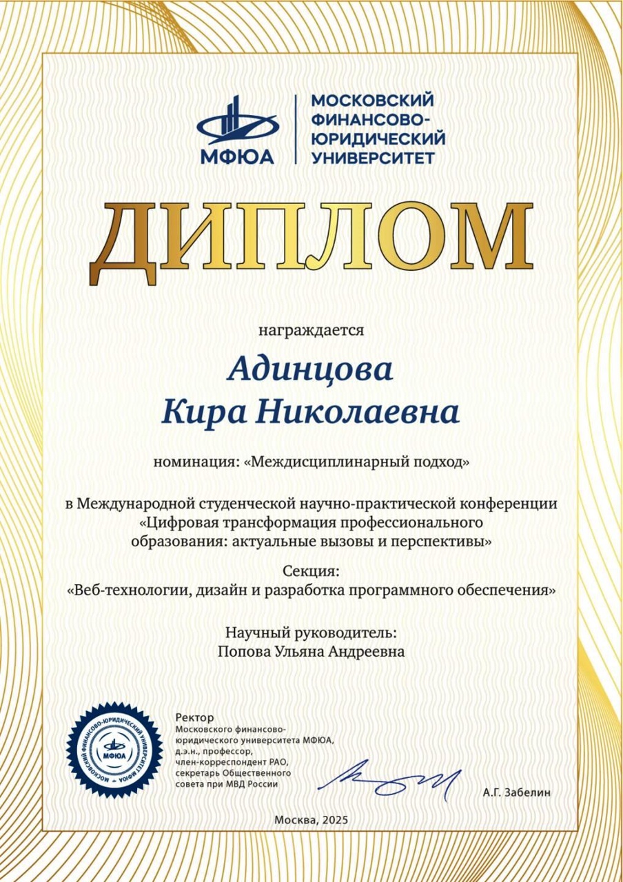 степени награждёны учащийся Адылин Назар Викторович (научный руководитель Нахаева Диана Викторовна) и преподаватель Гузова Янина Дмитриевна.