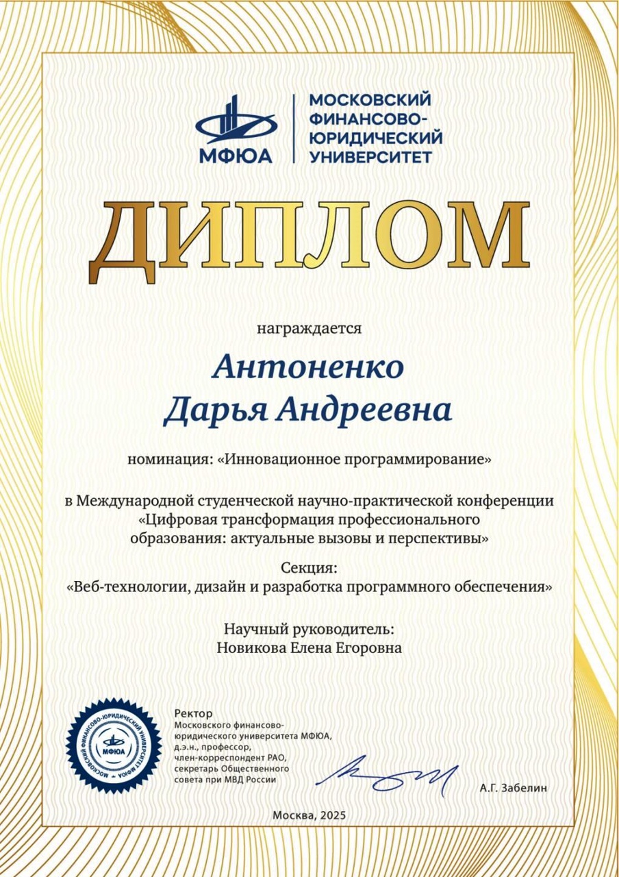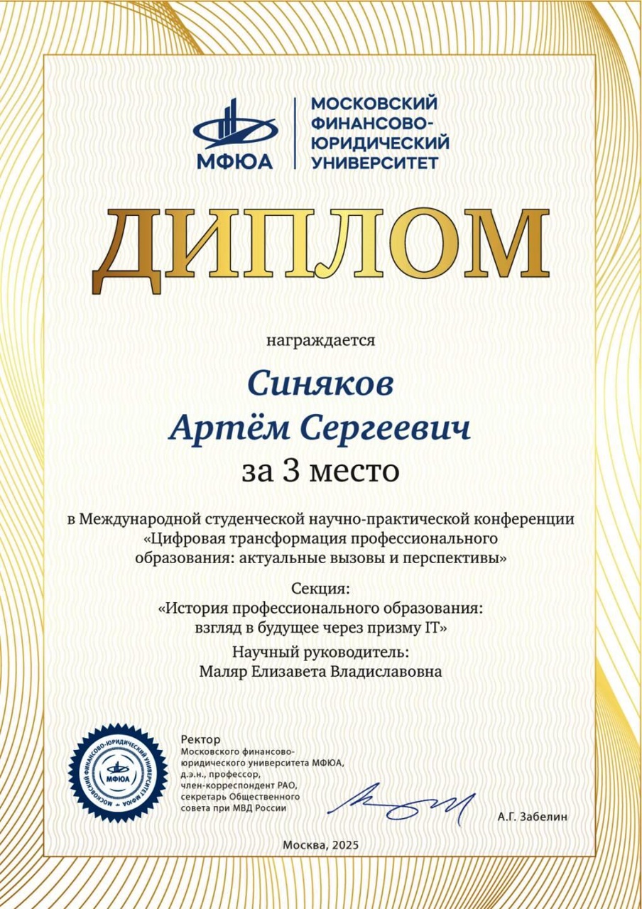 удостоен диплома II степени по направлению "Инновации, научные и производственные достижения в сфере моей будущей профессиональной
