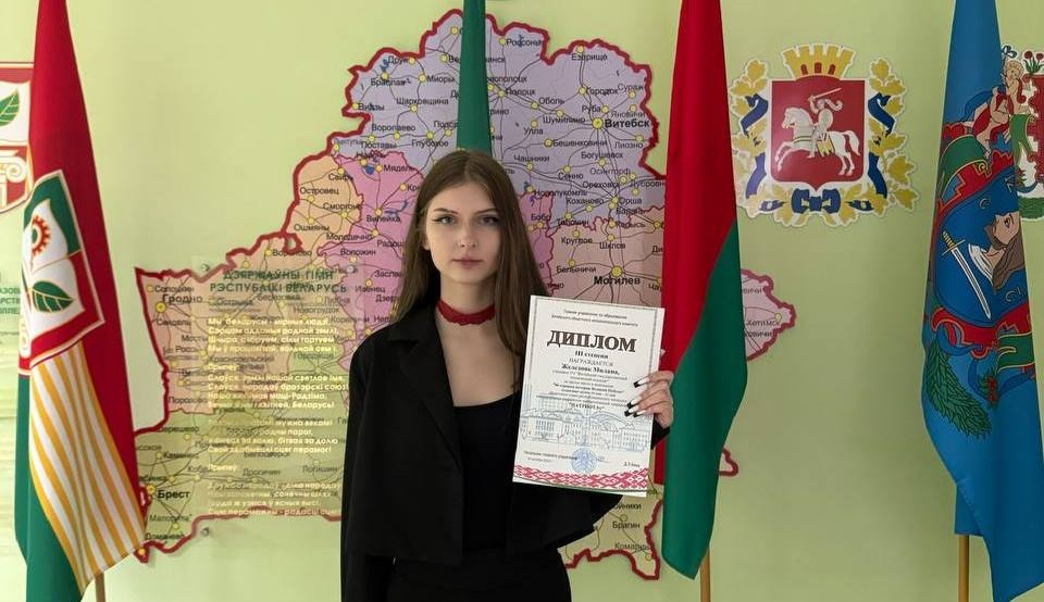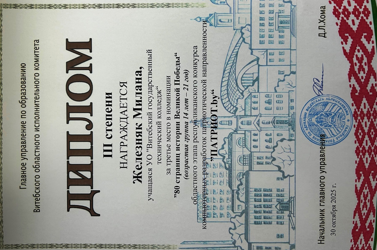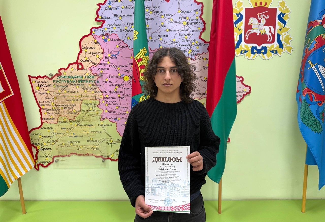 Учащийся II курса Вашневский Дмитрий Сергеевич награждён дипломом III степени главного управления по образованию Витебского областного исполнительного комитета третьего этапа республиканской олимпиады по учебному предмету "Трудовое обучение" в 2024/2025 учебном году.