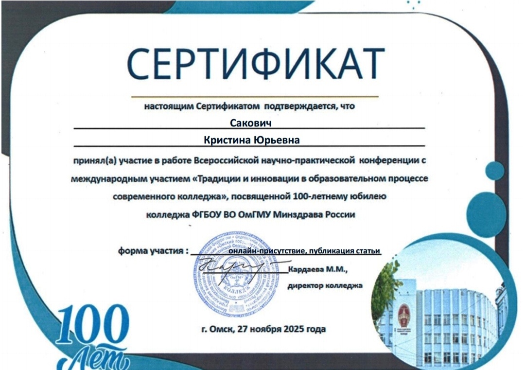 По результатам участия в V международной научно-практической конференции с использованием дистанционных технологий "Инновационные процессы в современном образовании: от идеи до практики" сертификат участника удостоена преподаватель Сакович Кристина Юрьевна.