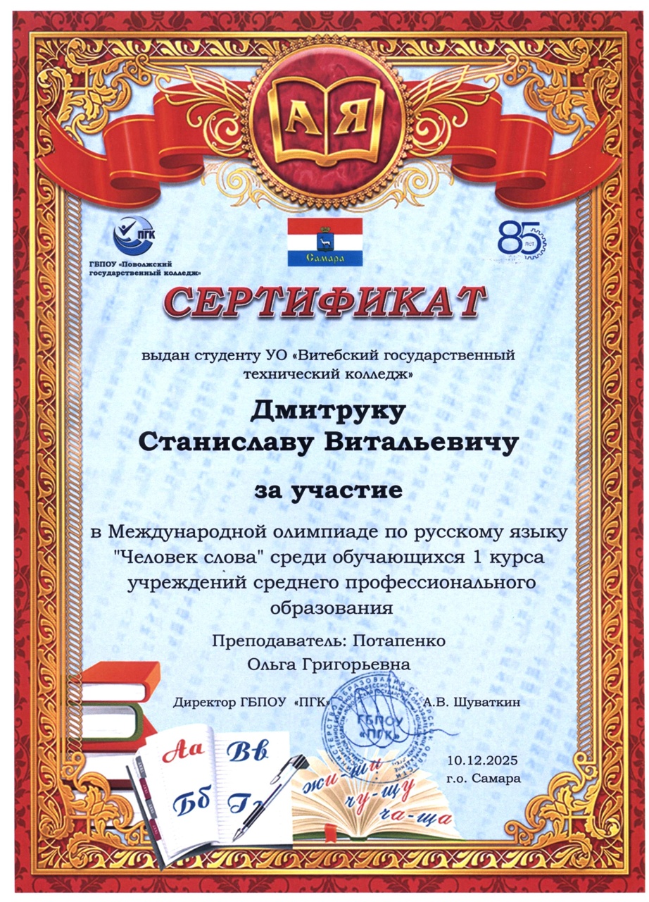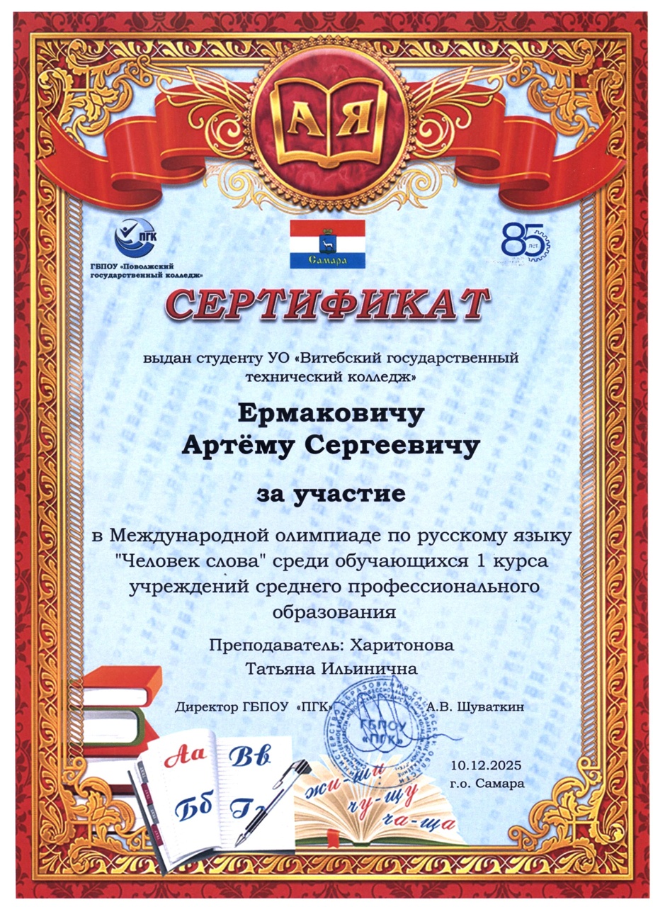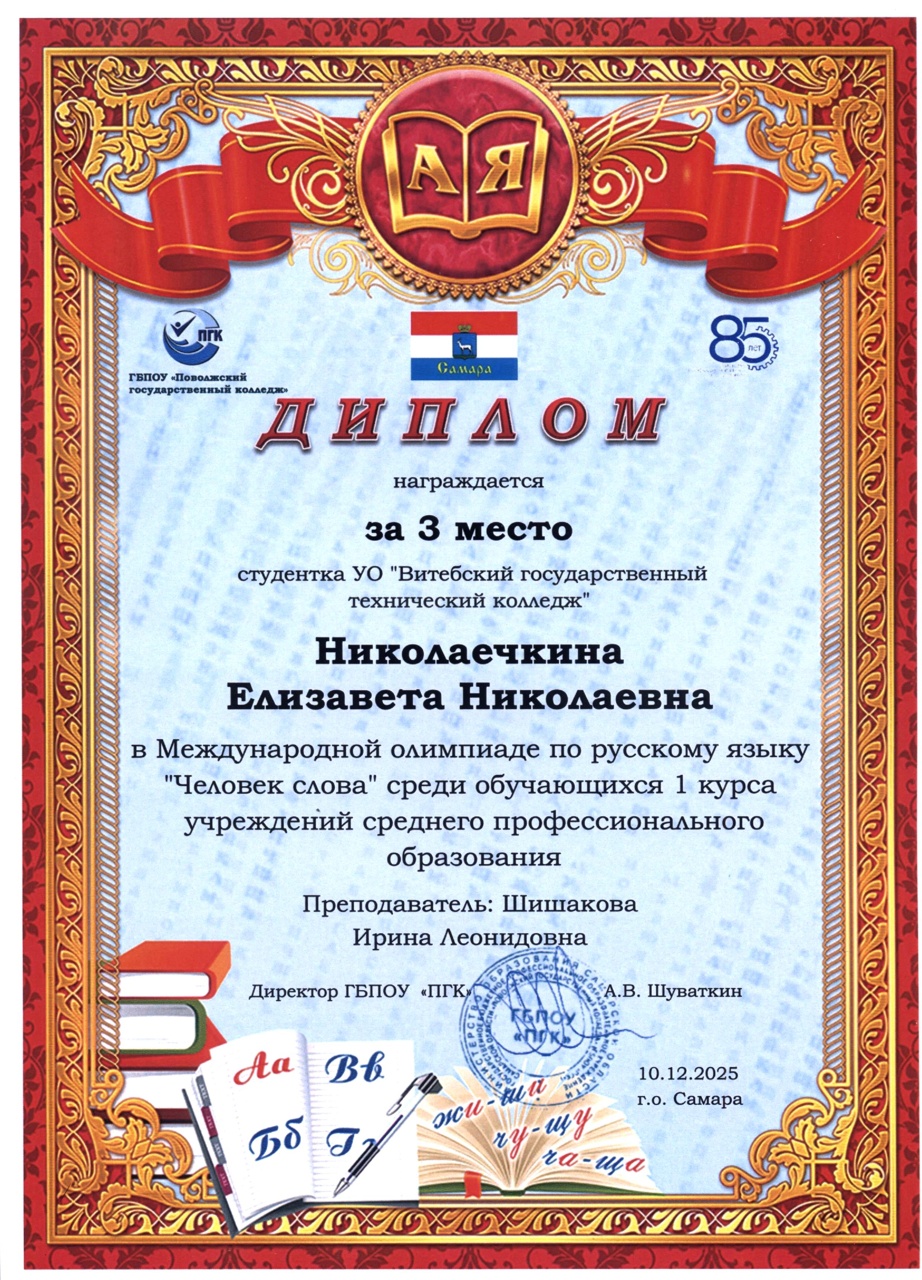 В декабре 2025 года состоялась международная олимпиада по русскому языку "Человек слова" среди обучающихся 1 курса учреждений среднего профессионального образования. Наши учащиеся и преподаватели заслуженно получили дипломы III степени и сертификаты участника.