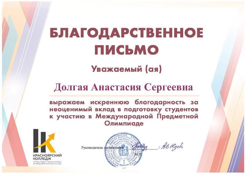Учащиеся колледжа Никита Горбатенко, Никита Вакульчик участвовали в Международной Предметной Олимпиаде по английскому языку, проводимой на базе КГБПОУ "Красноярский колледж отраслевых технологий и предпринимательства". Преподавателям Нахаевой Диане Викторовне, Долгой Анастасии Сергеевне вручены благодарственные письма за подготовку учащихся.