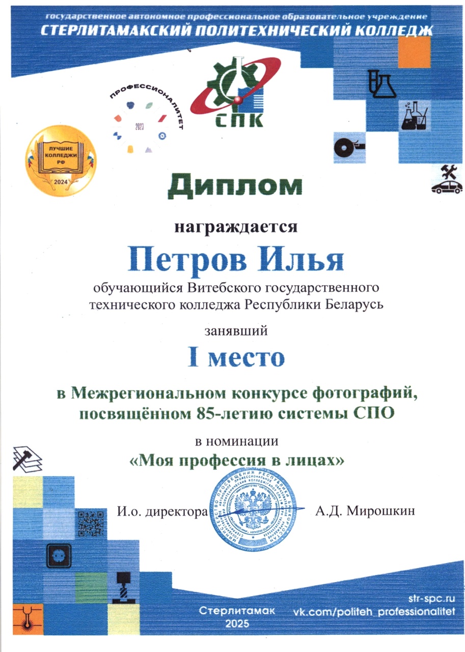 По результатам участия в Межрегиональном конкурсе фотографий, посвященном 85-летию системы ПТО дипломом 1 степени награждён учащийся Петров Илья, дипломом 2 степени награжден Новицкий Илья.