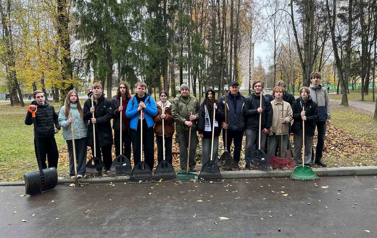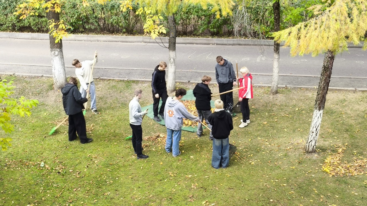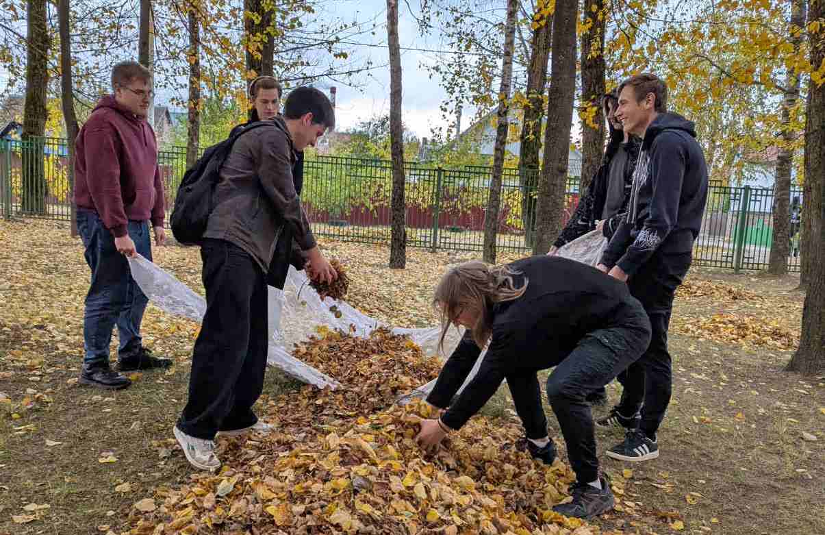 Учащиеся колледжа помогают убирать территорию от листвы, поддерживая чистоту и порядок на территории колледжа. Это важное занятие, которое учит их ответственности и командной работе.