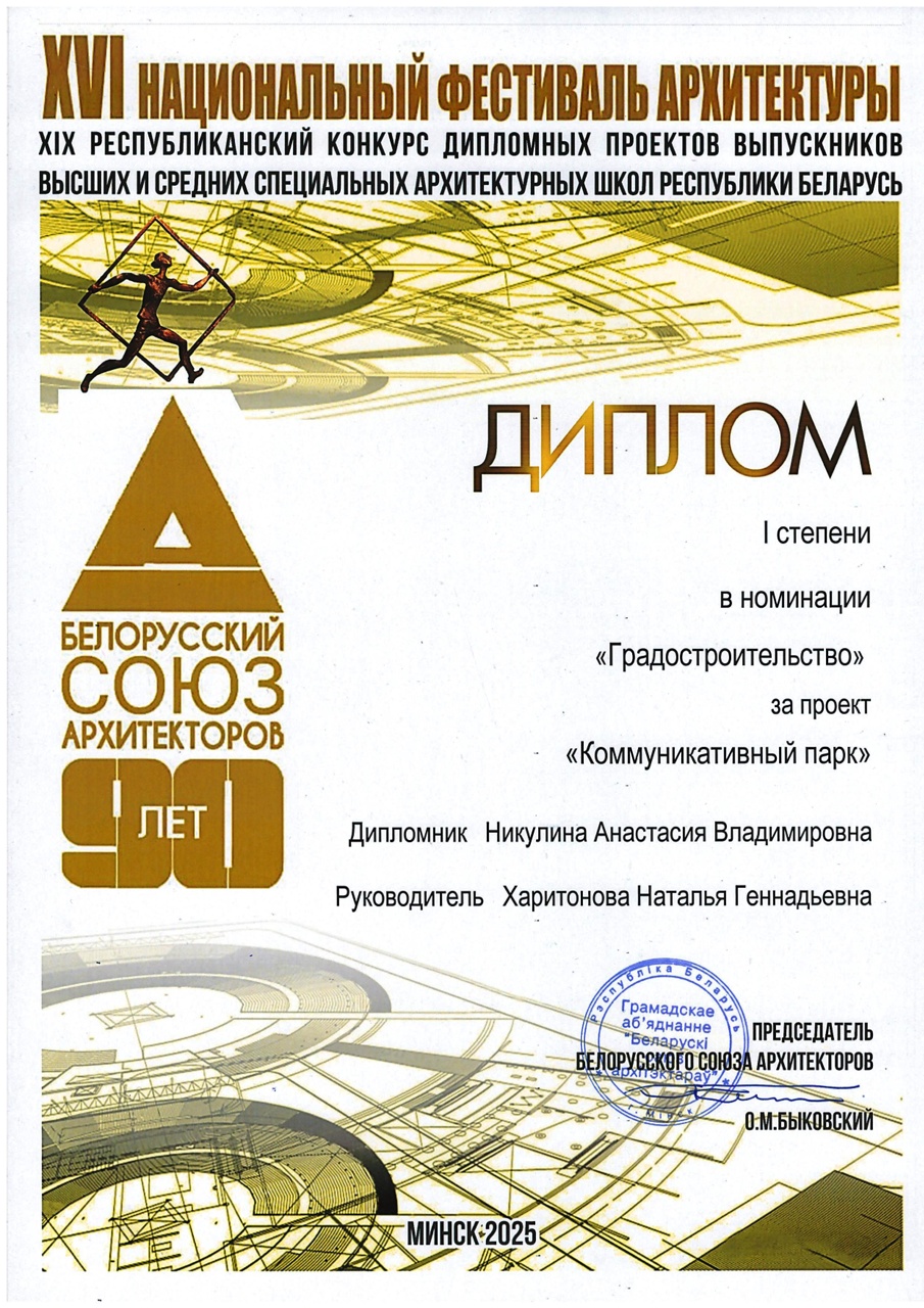 По результатам участия в XIX Республиканском конкурсе дипломных проектов выпускников высших и средних специальных архитектурных школ Республики Беларусь в номинации «Градостроительство», проект выпускницы колледжа Никулиной Анастасии Владимировны на тему "Коммуникативный парк" удостоен диплома I степени. Руководитель проекта - преподаватель Харитонова Наталья Геннадьевна.